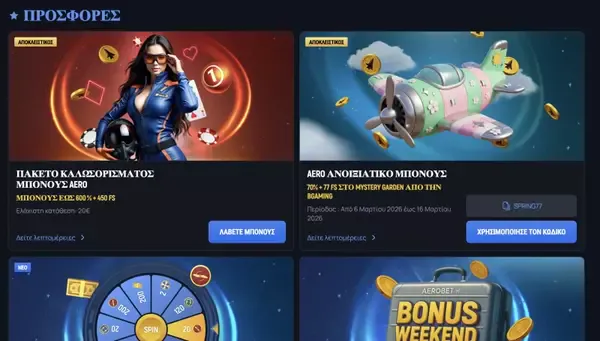 Τα μπόνους είναι προαιρετικά και μπορείτε πάντα να παίζετε χωρίς αυτά, αν το προτιμάτε. Οι προσφορές μπόνους Aerobet εμφανίζονται στον λογαριασμό σας ώστε να διαβάζετε τους όρους πριν επιλέξετε συμμετοχή. Στην Ελλάδα, η βασική προσφορά είναι ένα πολυβήμα πακέτο καλωσορίσματος συν εβδομαδιαίες προσφορές δωρεάν περιστροφών.