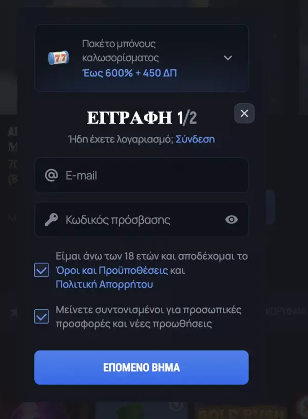 - Καταθέστε τουλάχιστον €20 για το τυπικό πακέτο καλωσορίσματος (ή €200 για την επιλογή high-roller) και επιβεβαιώστε την επιλογή μπόνους, αν εμφανιστεί.